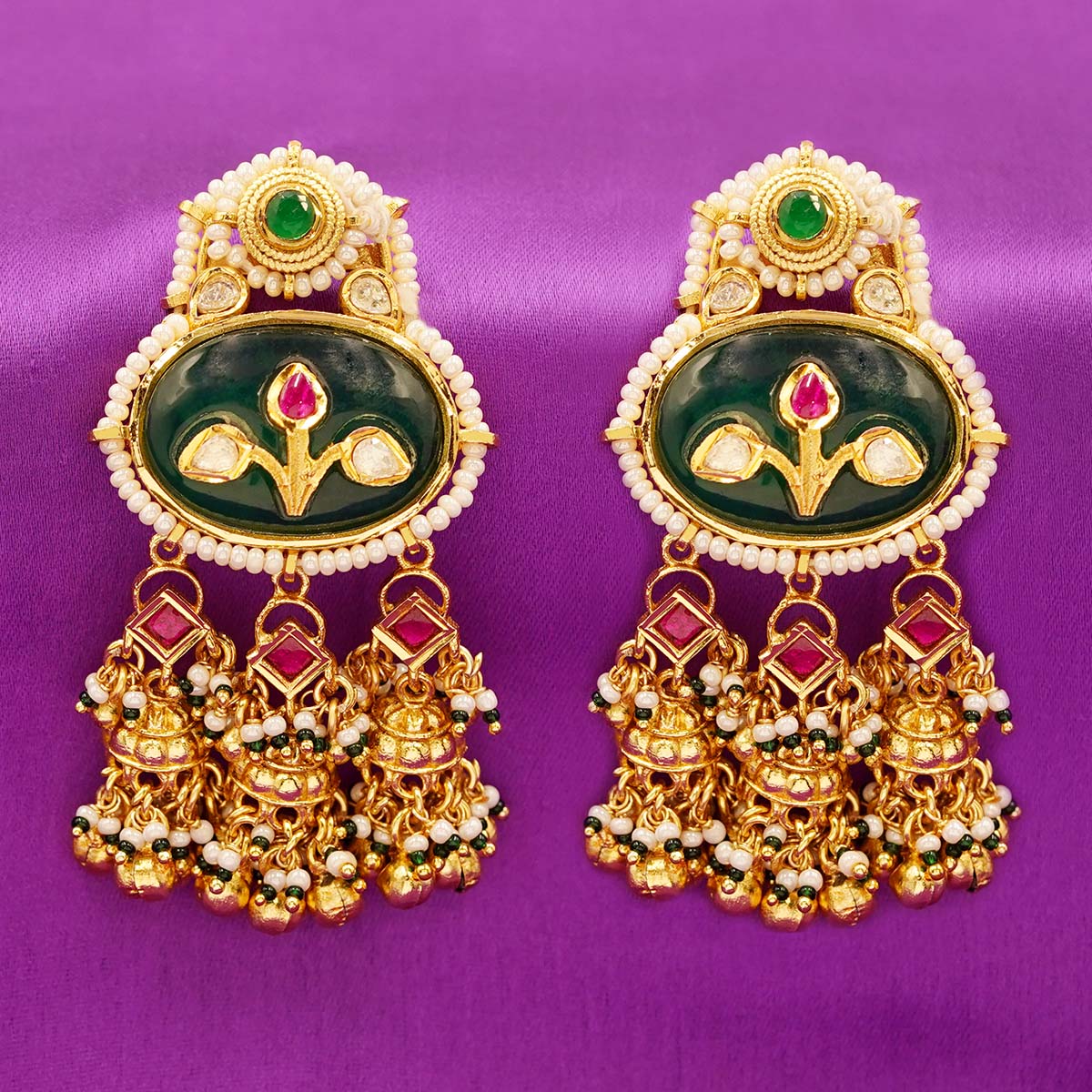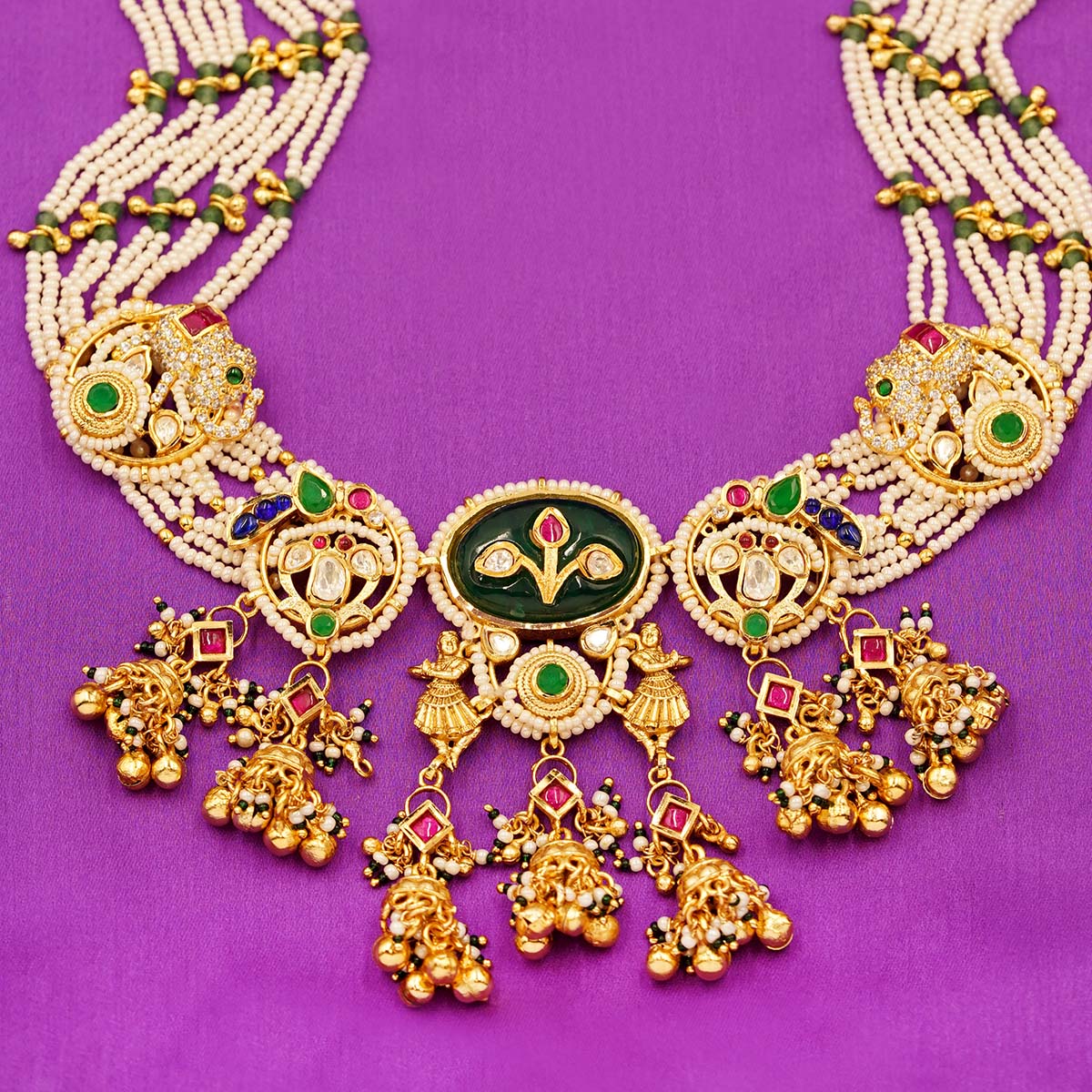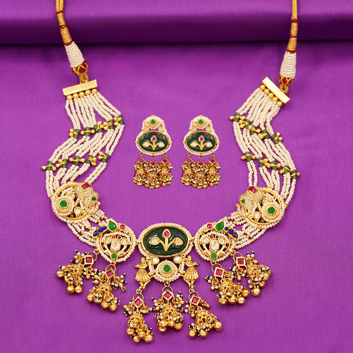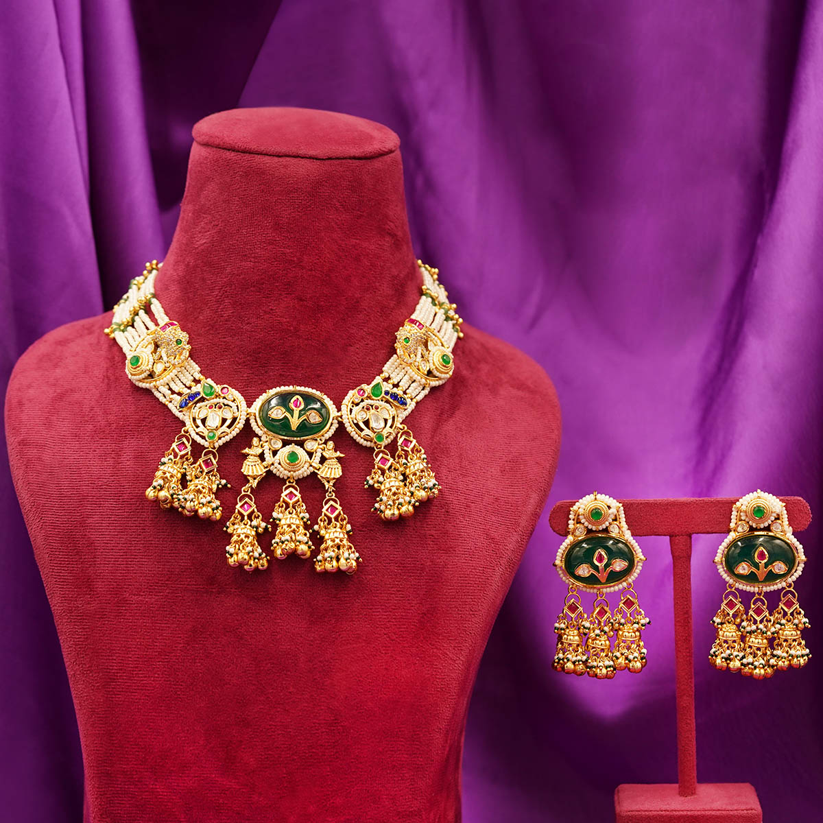 DESCRIPTION - This stunning necklace set showcases a rich South Indian traditional design with intricate detailing and vibrant green enamel work. The matching earrings complete the royal look, making it perfect for weddings, festive functions, and cultural occasions.