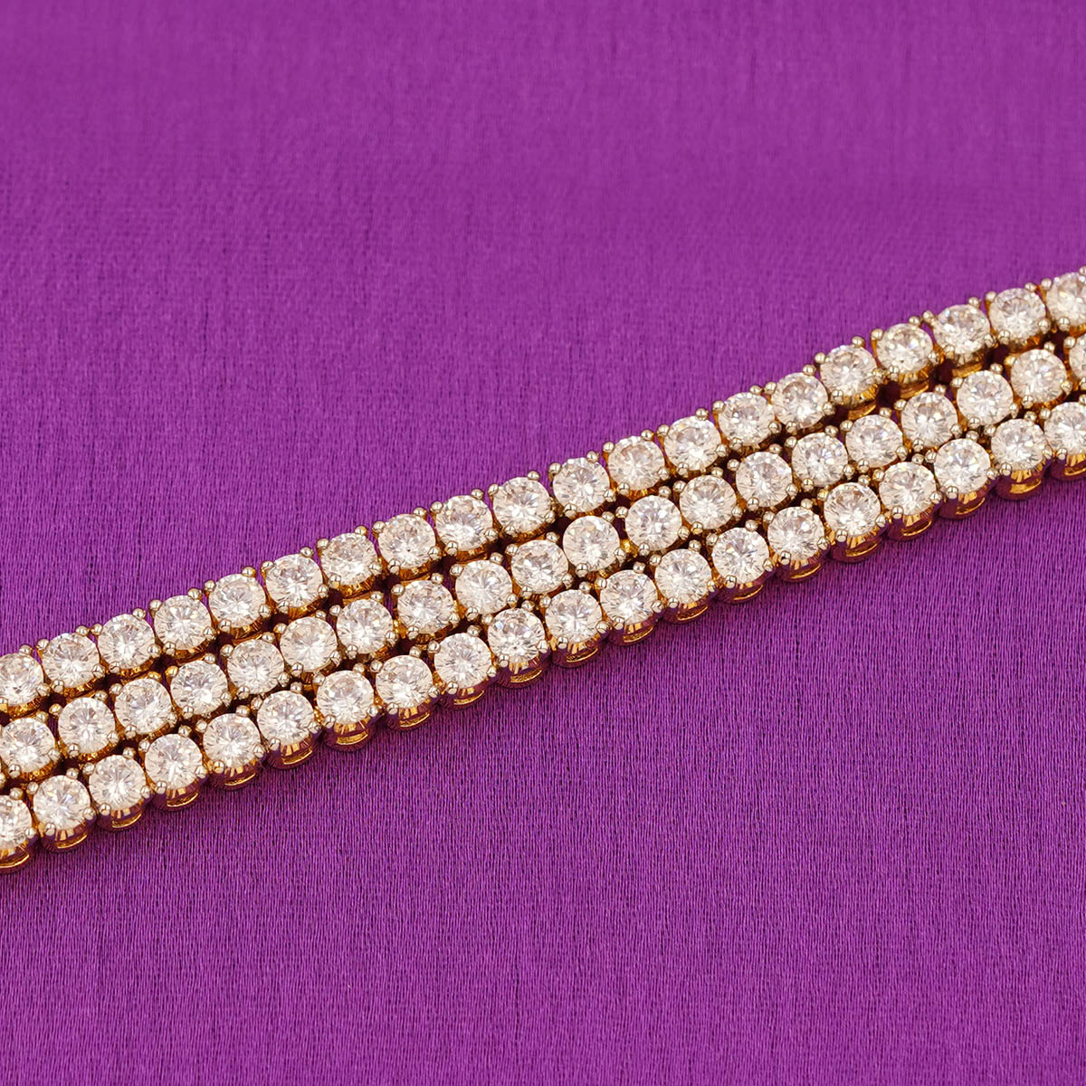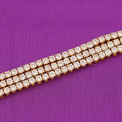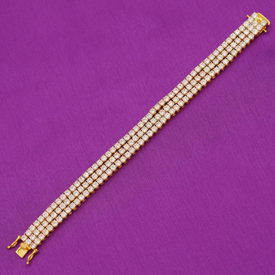 DESCRIPTION - A luxurious three-row designer bracelet crafted in a rich gold-tone finish, beautifully adorned with closely set shimmering stones. The centre features a stylish gold-Tone clasp element, adding a touch of elegance and premium detailing. Its flexible triple-line design gives it a grand, high-end appearance — perfect for weddings, parties, and special occasions.