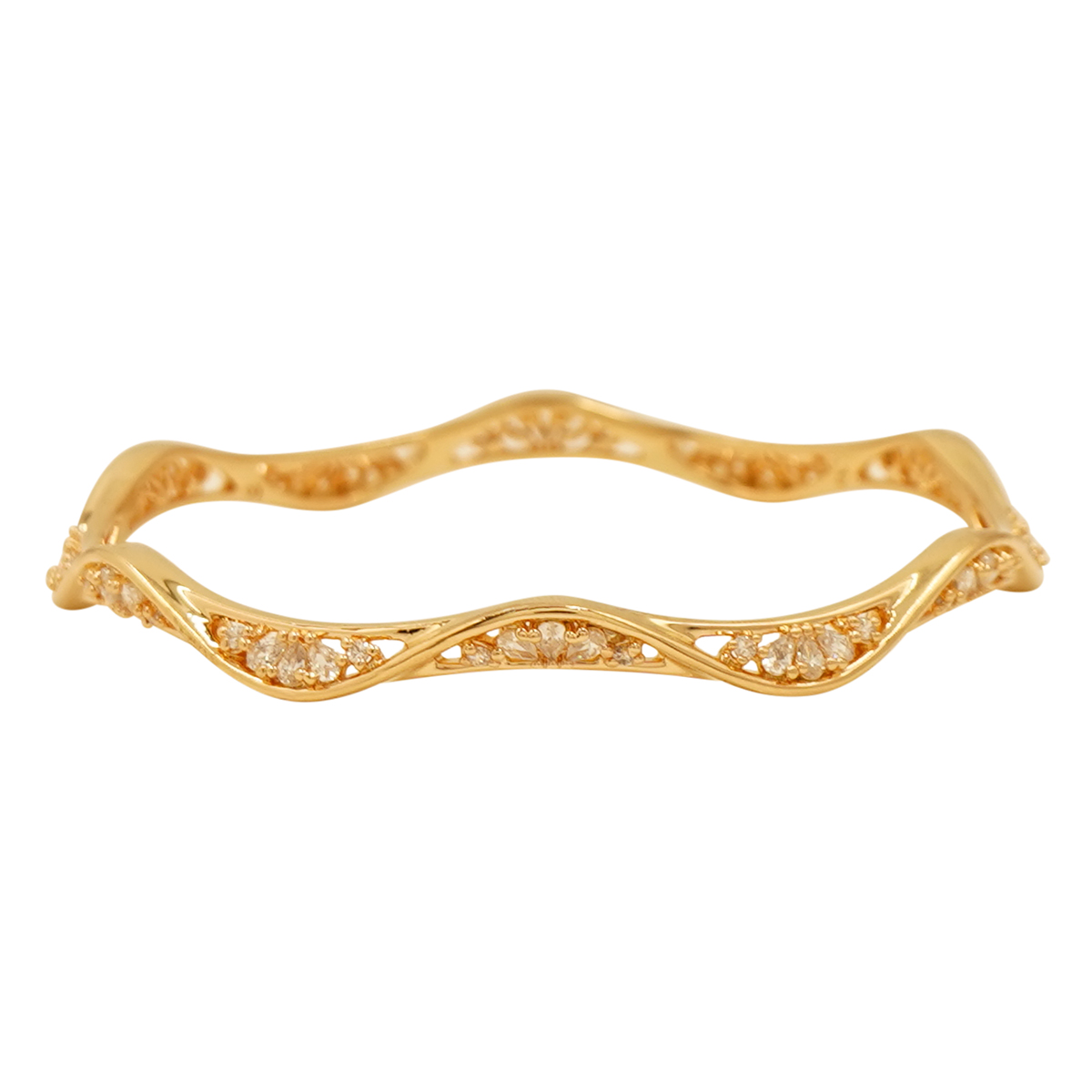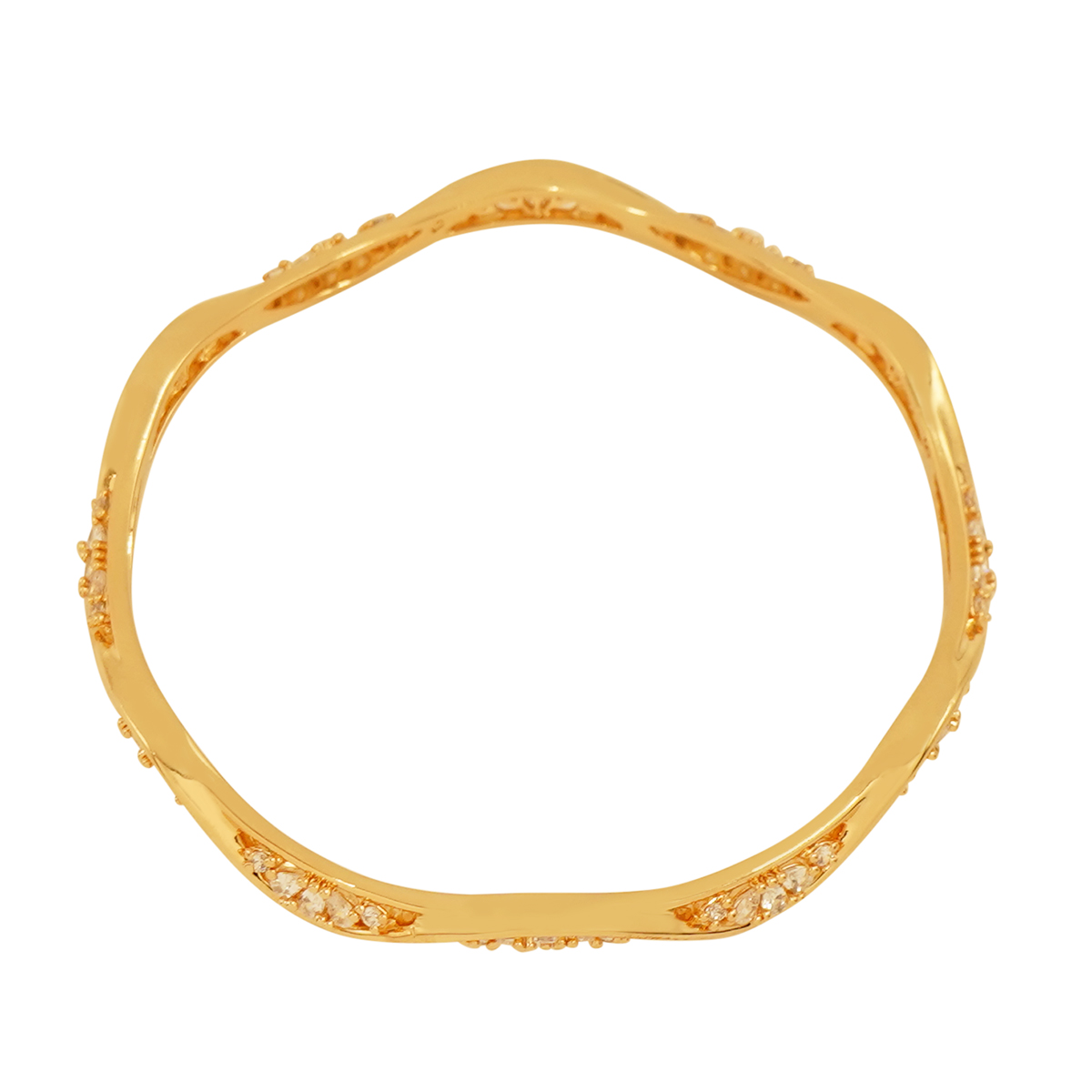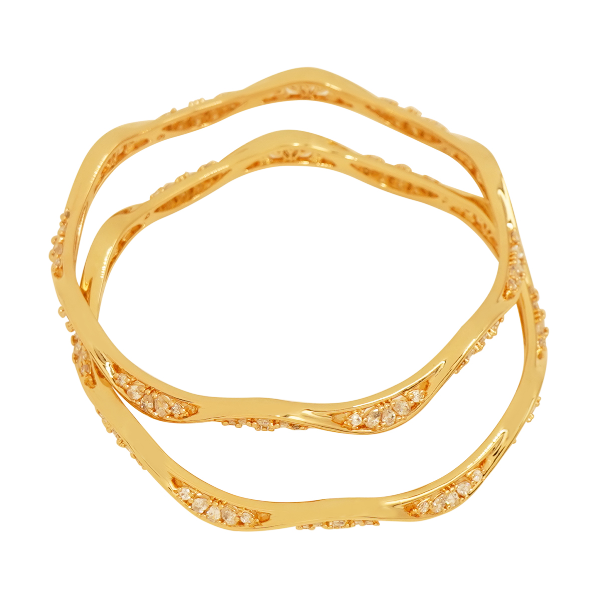DESCRIPTION - This stylish bangle pair features a unique wavy design adorned with sparkling stones that add a graceful shimmer from every angle. these bangles are lightweight, elegant, and perfect for both daily wear and special occasions. A chic and modern addition to your jewellery collection, offering a blend of simplicity and sparkle.