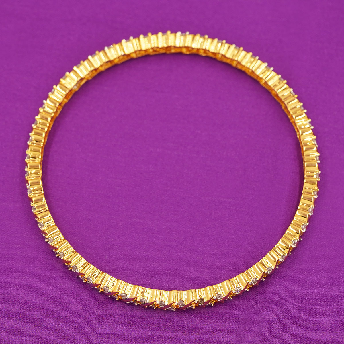 DESCRIPTION - A sleek and elegant bangle pair featuring a continuous X-pattern design, set with sparkling CZ stones for a premium shine. The gold-finish frame adds a rich look, making it perfect for daily wear, festive styling, or pairing with ethnic outfits. Lightweight, classy, and effortlessly stylish.