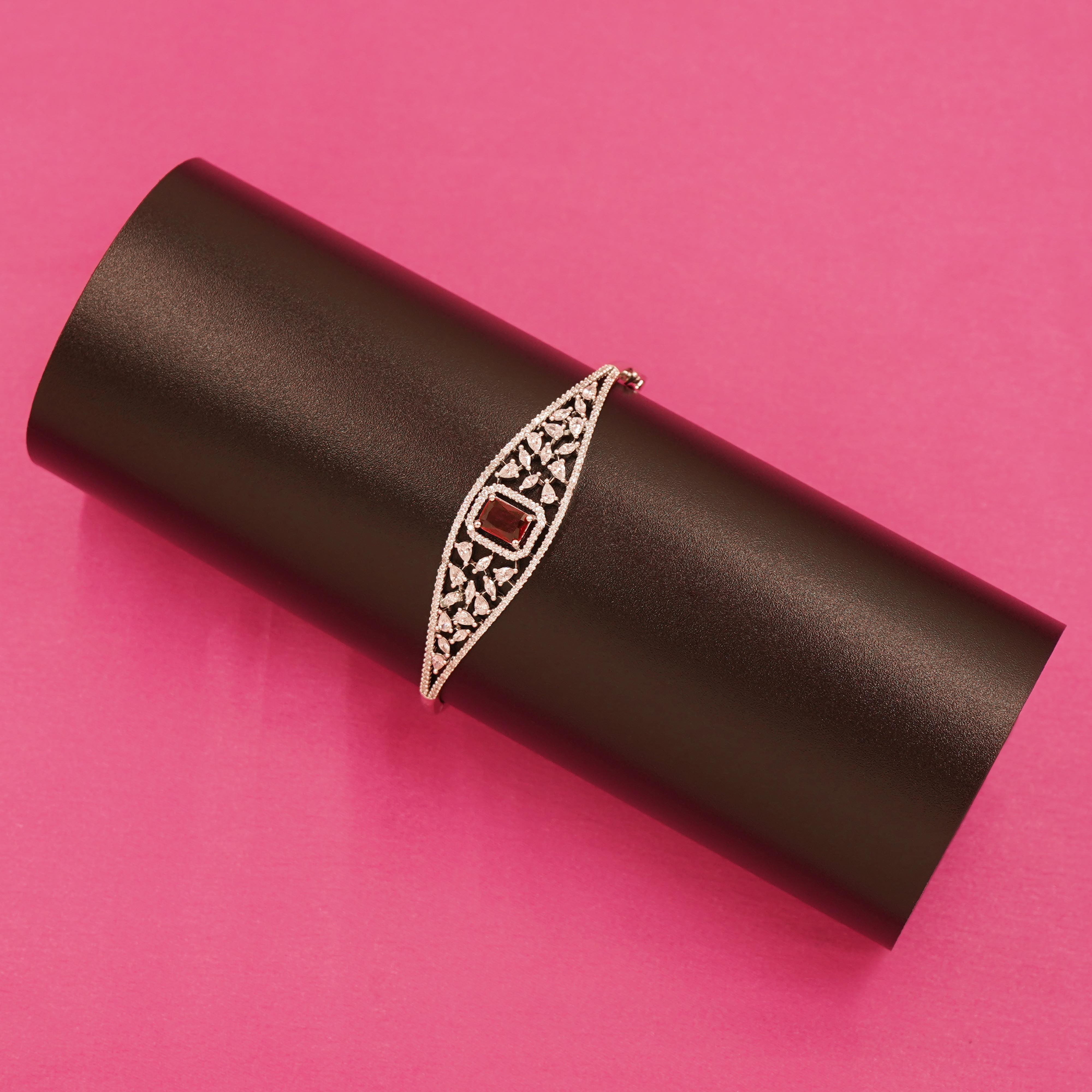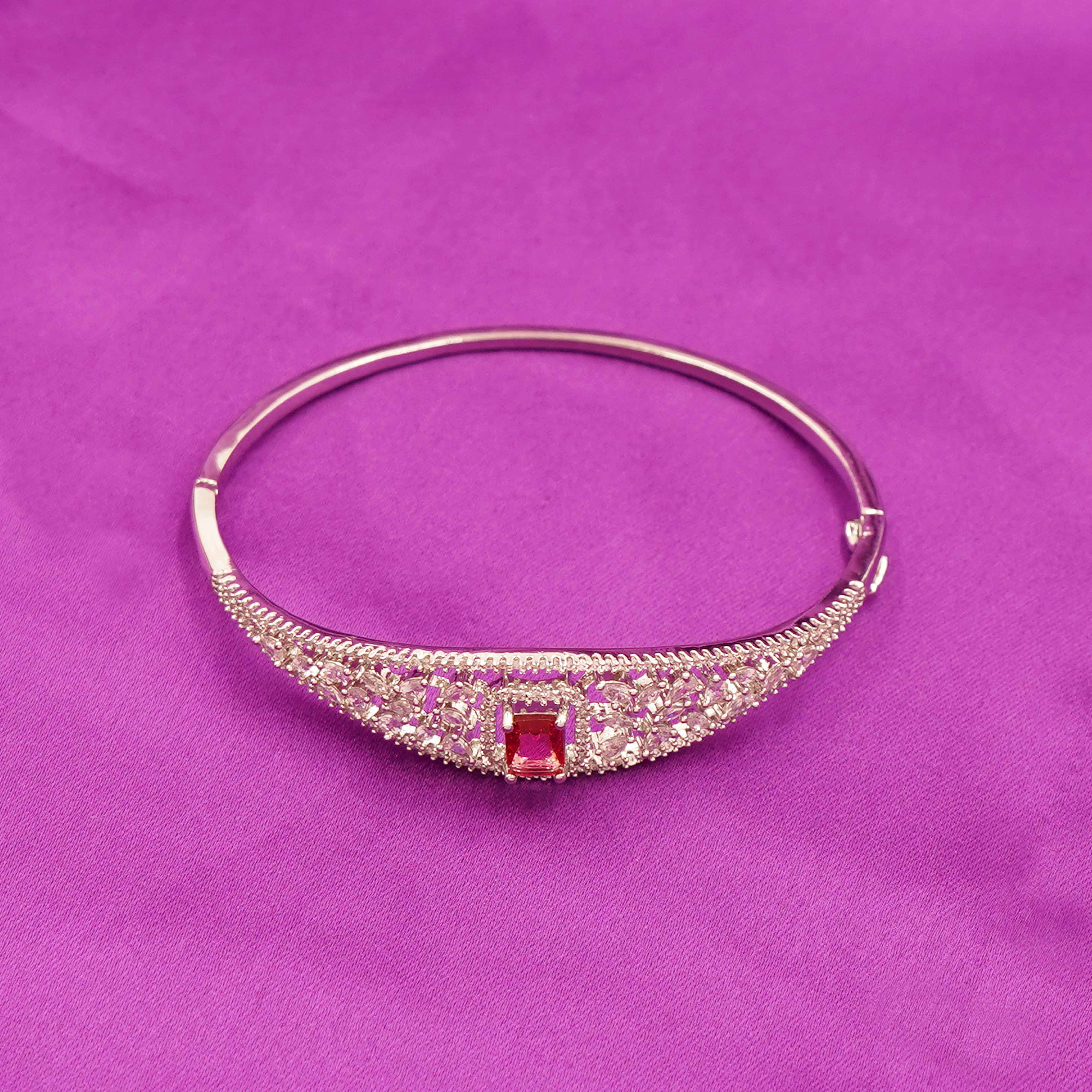 ZIRCON BRACELET / Sleek Silver-Tone Bracelet with Geometric Cutwork and Red Color Stone Center