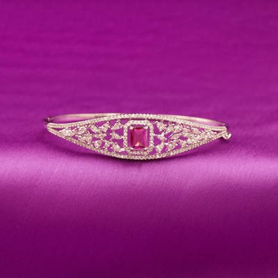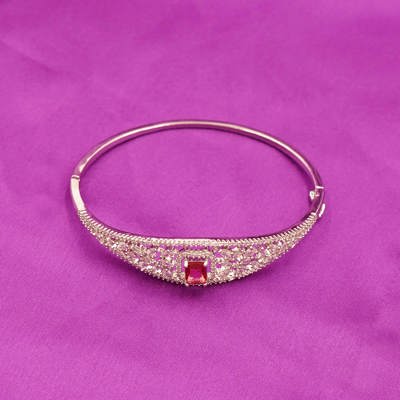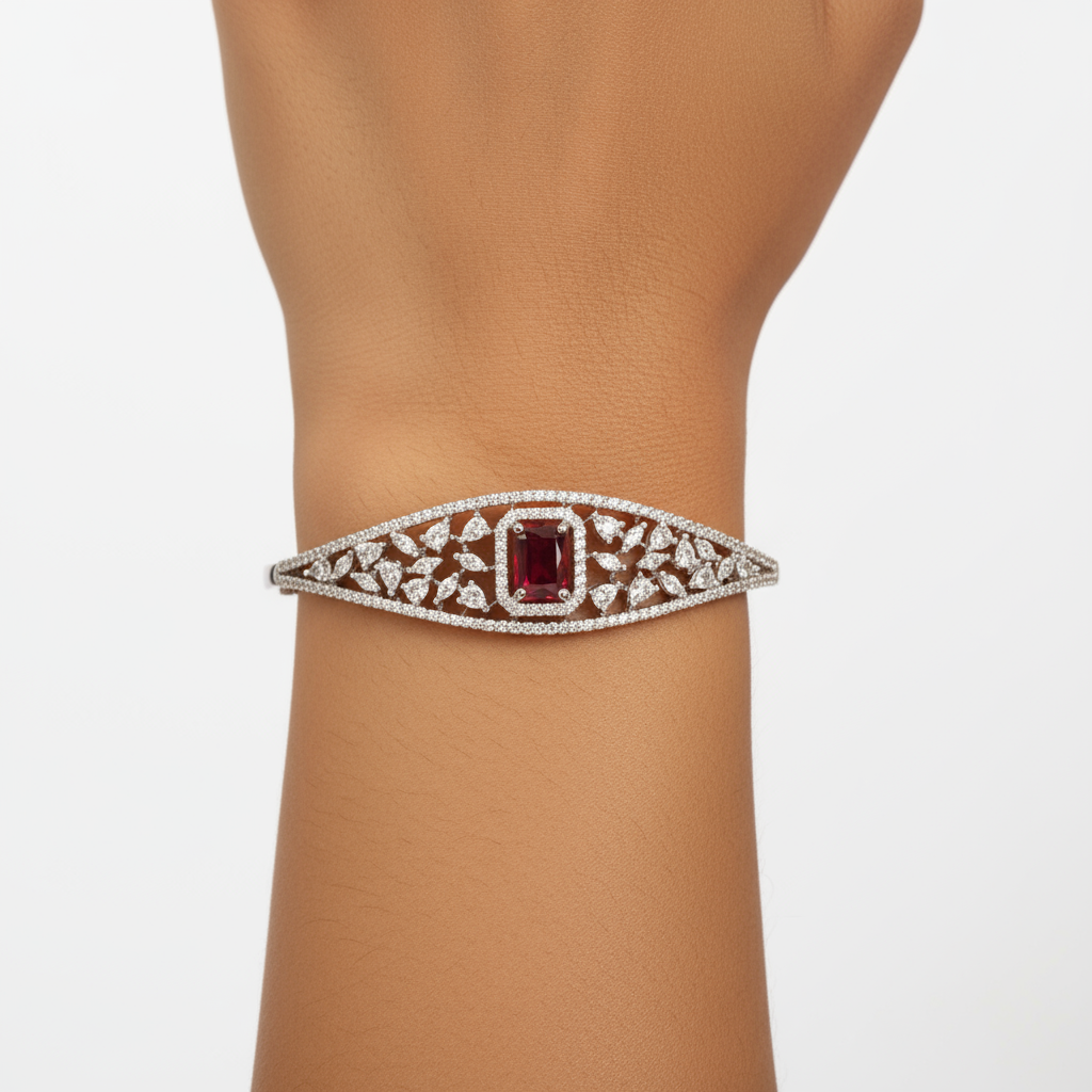 DESCRIPTION - This stylish bracelet features a sleek silver-tone design with intricate geometric cutwork, highlighting a striking rectangular red stone at its center. The combination of bold centerpiece and delicate detailing makes it an elegant accessory, perfect for both traditional celebrations and modern evening wear.